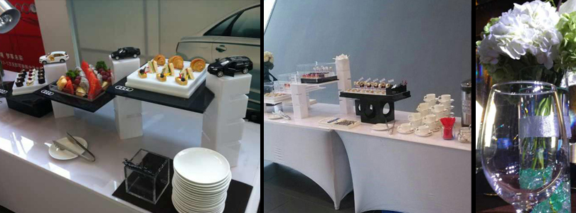 奥迪A8L携手蓝戈宴会为高端客户答谢/新客户咨询/试驾展示提供餐饮服务保障。手指美食、蛋糕、西点、冷盘组合。蓝戈宴会以精致的出品和服务获得了奥迪’指定餐饮供应商’的机会。蓝喜爵宴会秉承着”您的想象力在这里”的全心服务理念,携手金地地产上演了一场优雅与时尚的奢华冷餐宴会。 各色饮品、特别定制的台湾美食,使嘉宾畅享前所未有的宴会之旅。